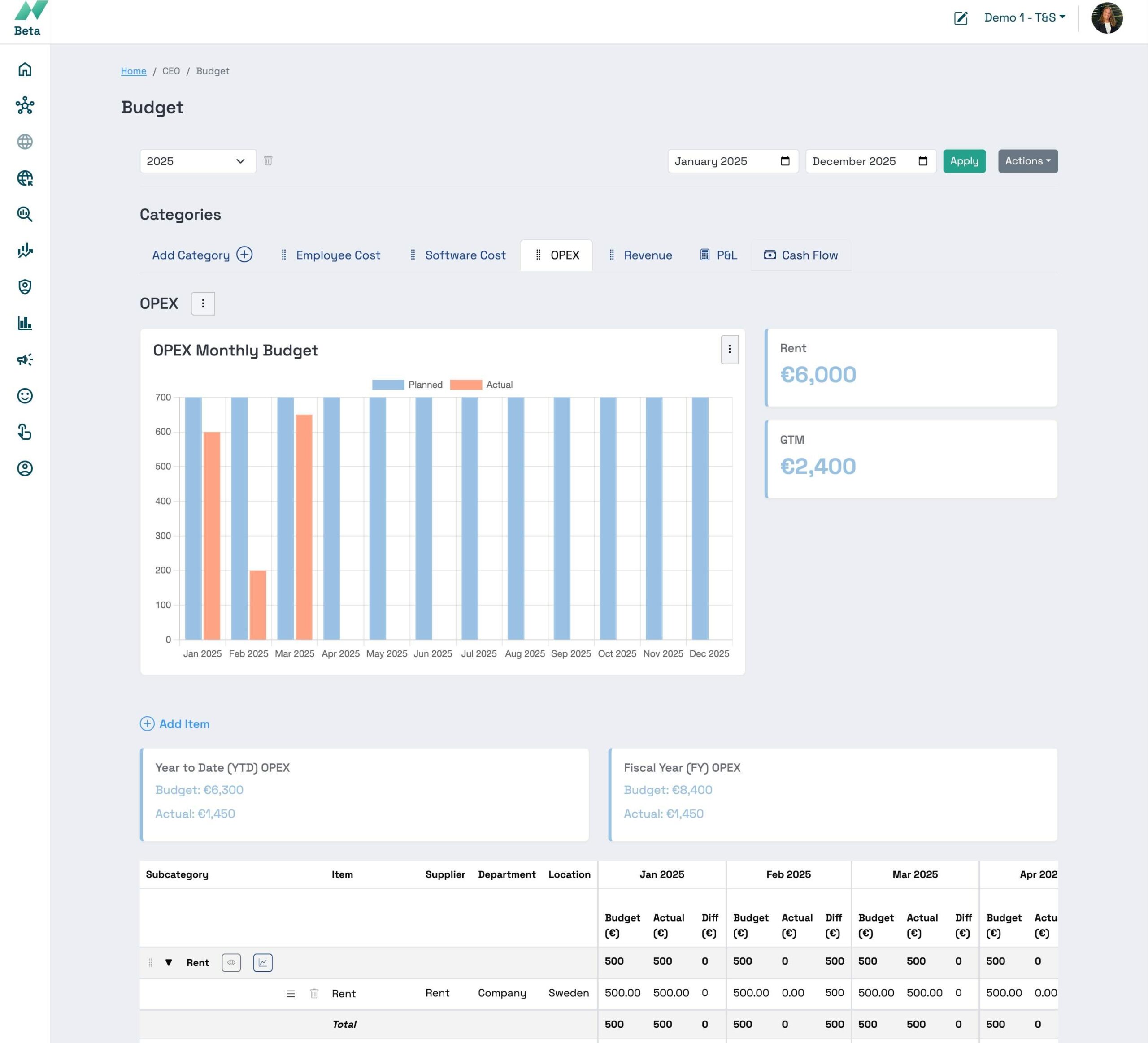 As your startup/scale-up grows, the budget app scales with you. It adapts to changes in company size, the complexity of budget tracking, and departmental needs. Whether your budget is small and simple or grows to include more detailed allocations across multiple functions, the app provides the flexibility to accommodate changes without sacrificing clarity or control.